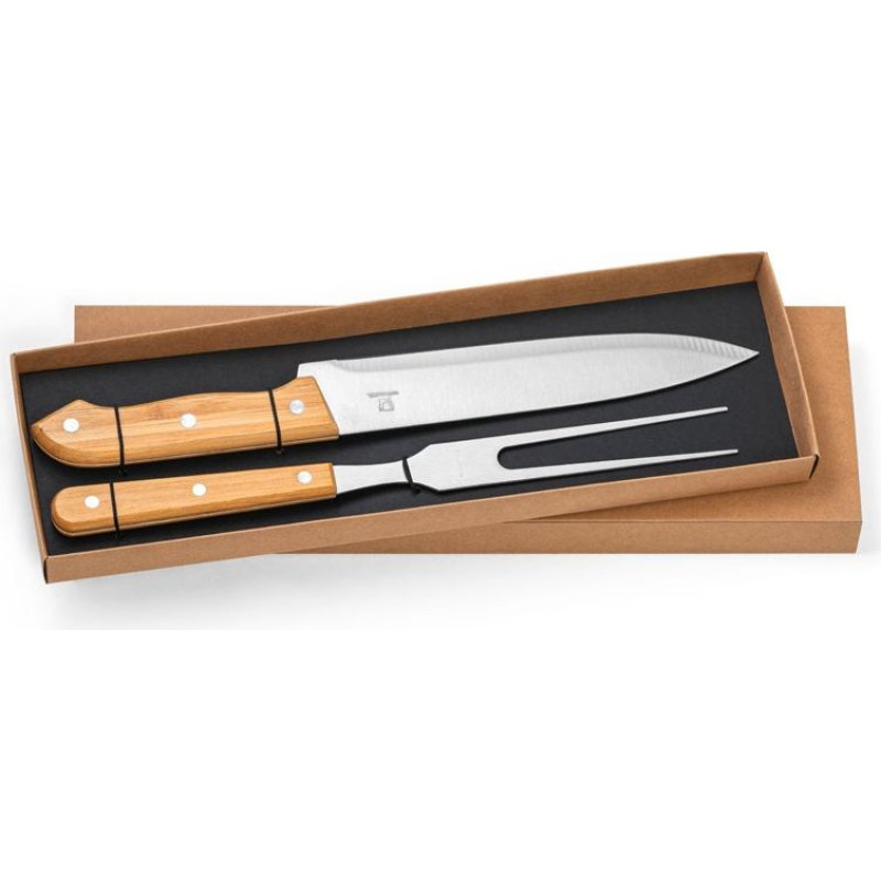 Two-piece barbecue set. Includes stainless steel steak fork and knife with bamboo handles. Supplied in a kraft paper box. As the product is made from natural materials, the colour and the printing result may vary between products. Box: 340 x 115 x 25 mm