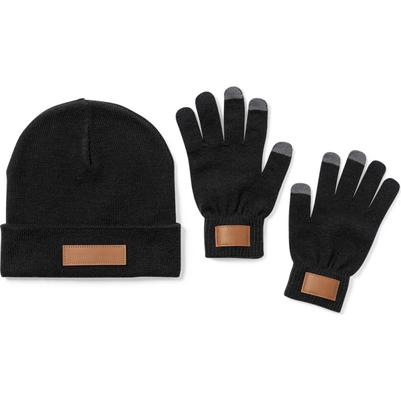 Set of hat and gloves in adult size, made of elastic acrylic material and with a stitched PU patch for branding. Including: Pair of gloves with 3 tactile fingers and elastic wrist adjustment. Matching hat with hem.