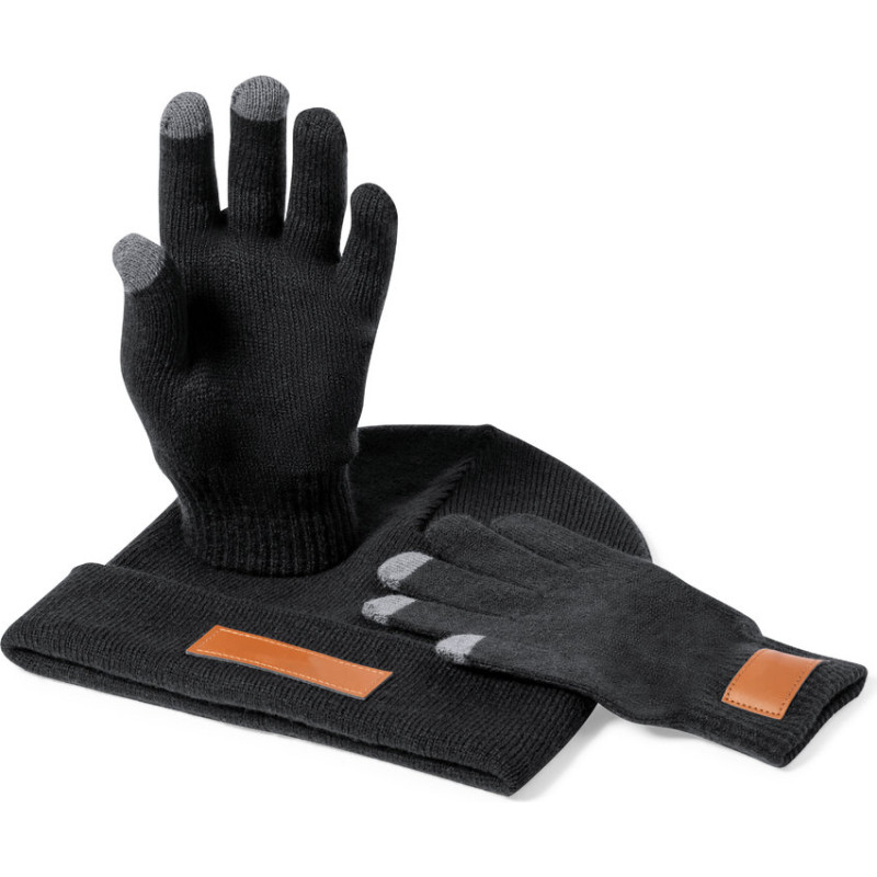 Set of hat and gloves in adult size, made of elastic acrylic material and with a stitched PU patch for branding. Including: Pair of gloves with 3 tactile fingers and elastic wrist adjustment. Matching hat with hem.