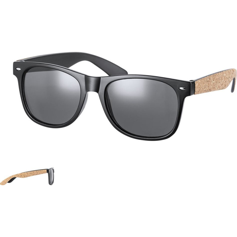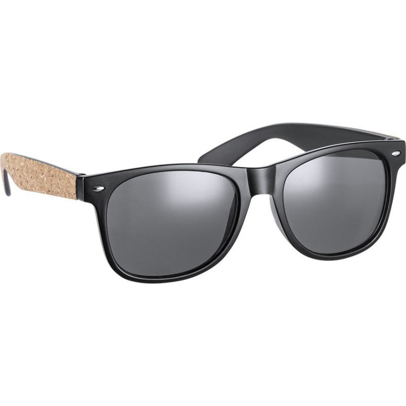 Nature line sunglasses with UV400 protection. Black frame in durable PC material, with matching tinted lenses and natural cork coated arms. Presented in an attractive eco-design case.