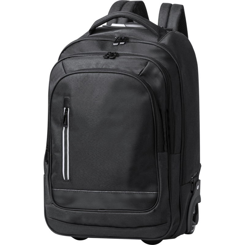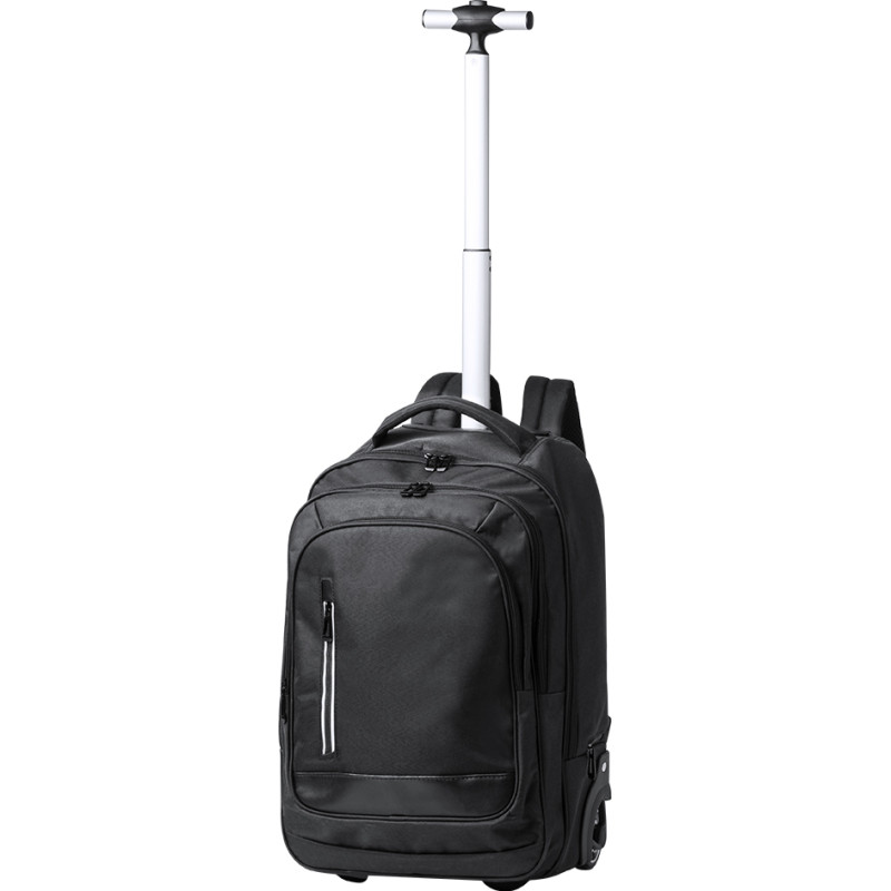 2 wheeled trolley backpack in high quality 300D polyester. Includes padded inner compartment for laptops up to 15 inches. With matching reinforced outside handle and practical front pockets. With matching zips, plus padded, concealed shoulder straps at the back, to be used as a backpack. Presented in an individual recycled bag.
