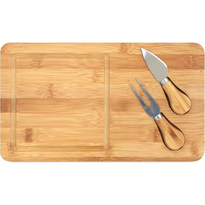 Bamboo cheese board with 2 bamboo and stainless steel accessories. Supplied in a kraft paper gift box. As the product is made from natural materials, the colour and the printing result may vary between products. 310 x 180 x 15 mm | Box: 316 x 186 x 25 mm