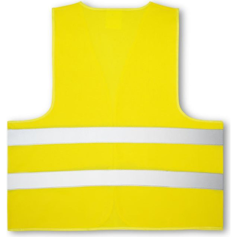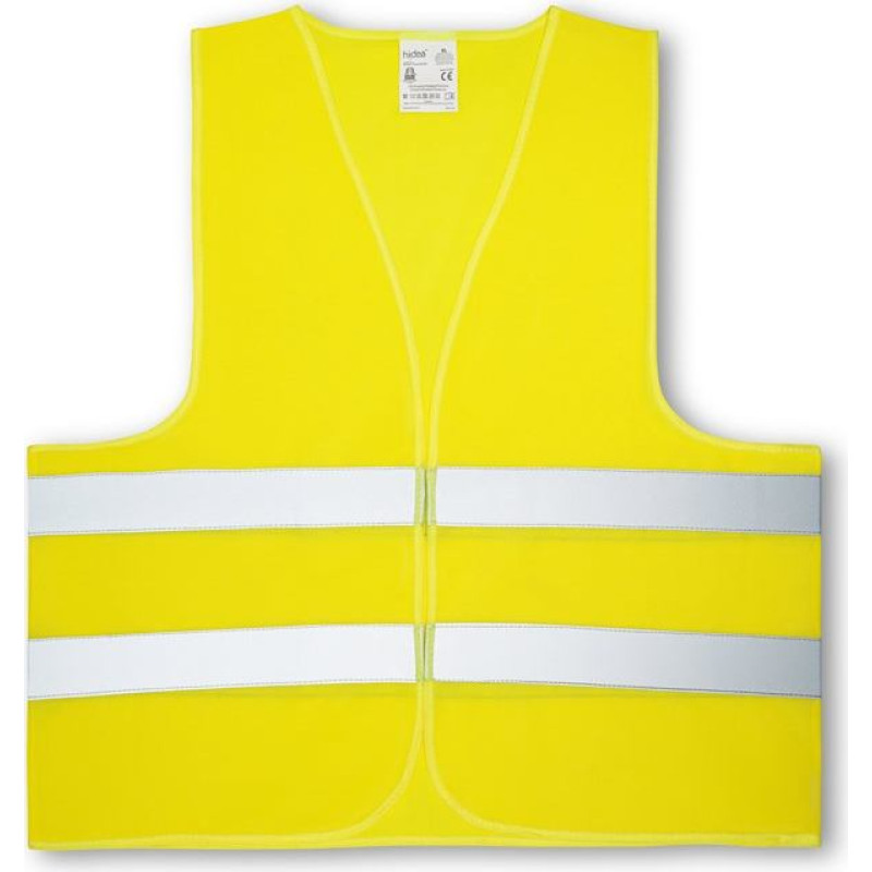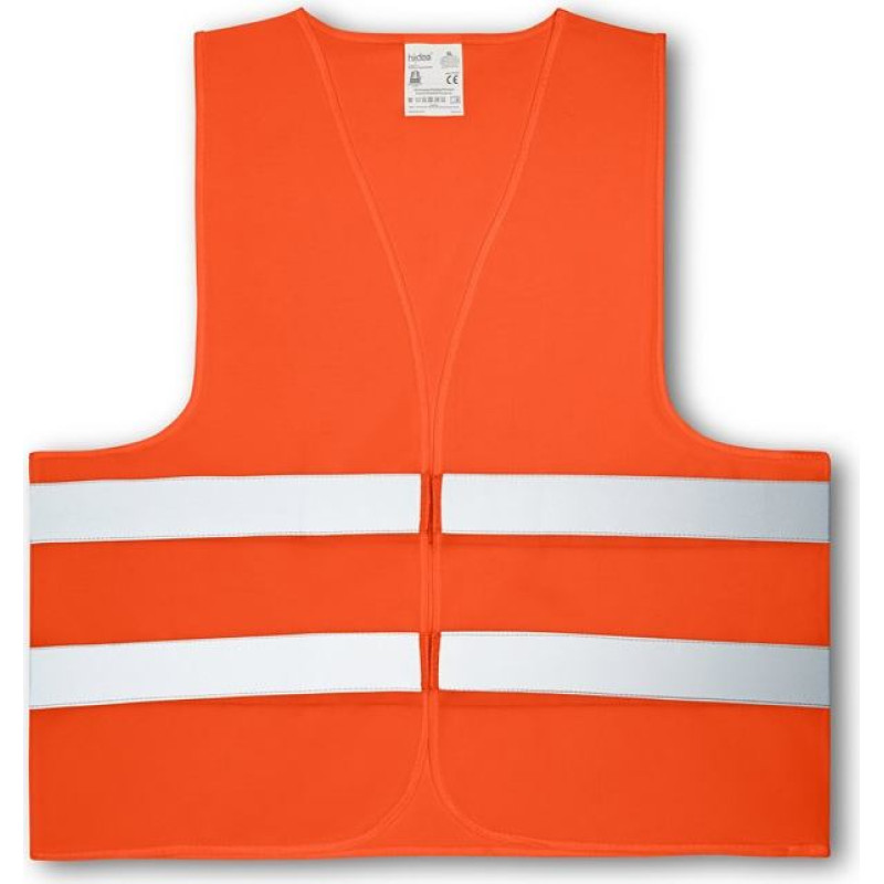 100% polyester high visibility vest certified with EN ISO 20471 class 2. Reflective vest with 2 horizontal reflective bands and a self-adhesive hook and loop fastener front opening. One size: 670 x 700 mm