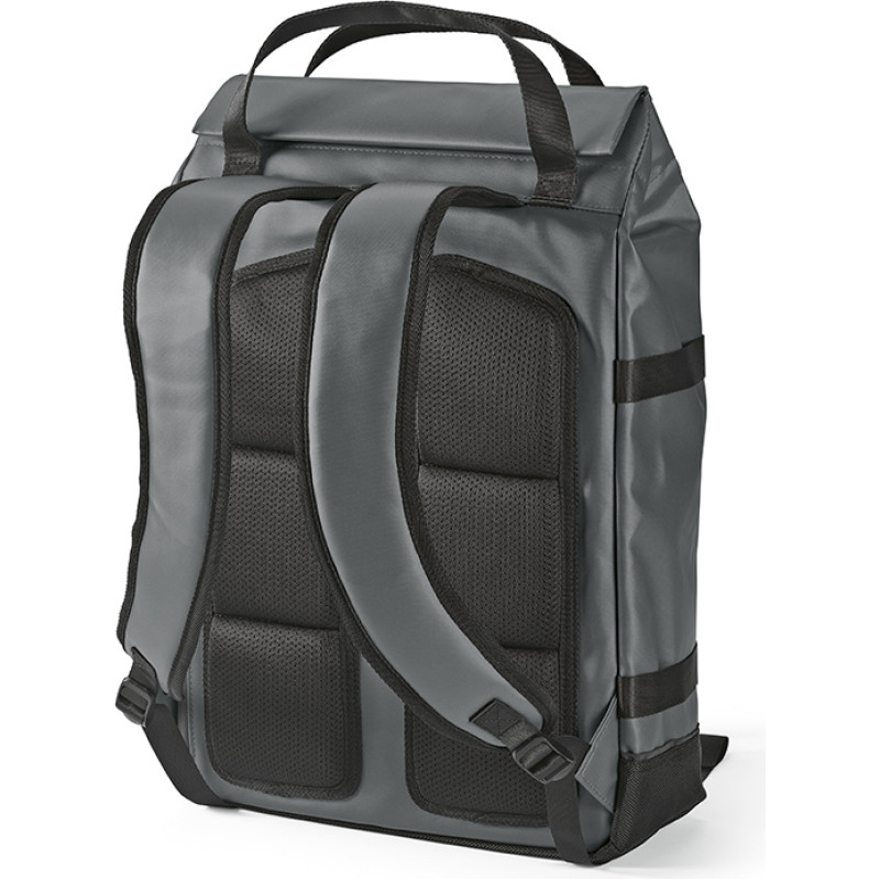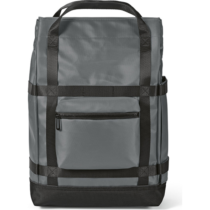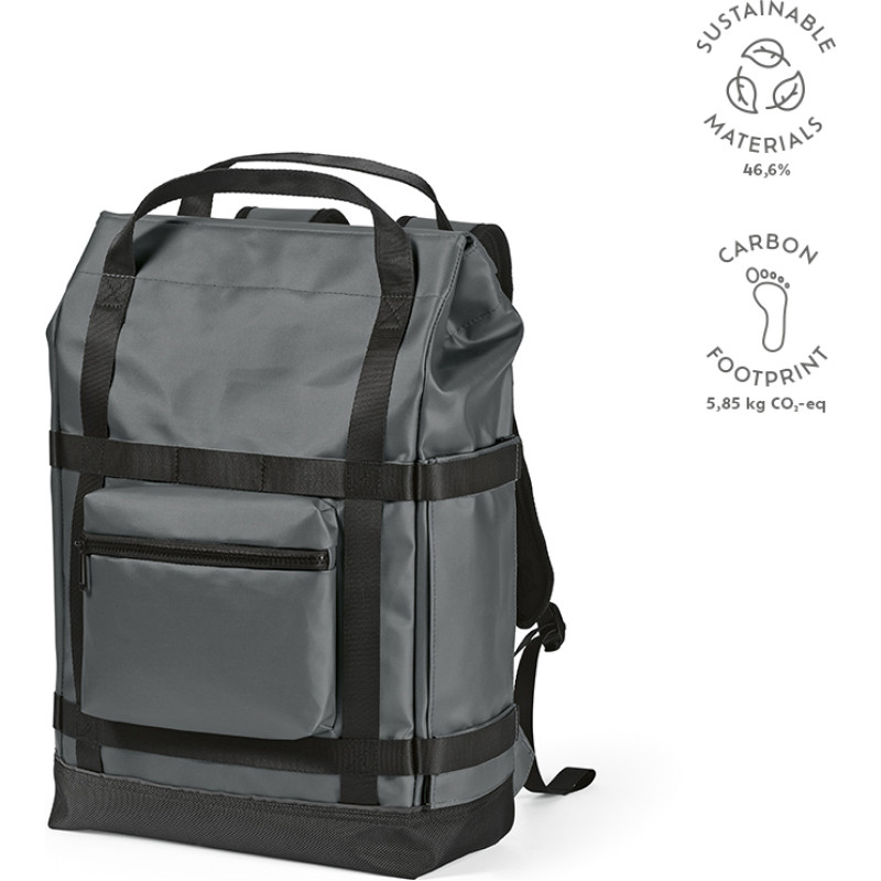 Waterproof 21L Backpack made of rPET. A hidden side pocket allows you to access your 17” laptop without opening your bag. The drawstring closure inner compartment will also ensure your belongings stay completely dry. Features a unique magnetic closing system padded lumbar support and 2 padded shoulder straps for added comfort and side pockets. All presented in an individual recycled cotton bag.
