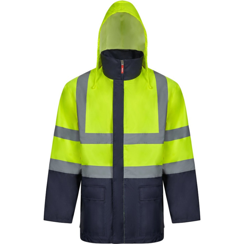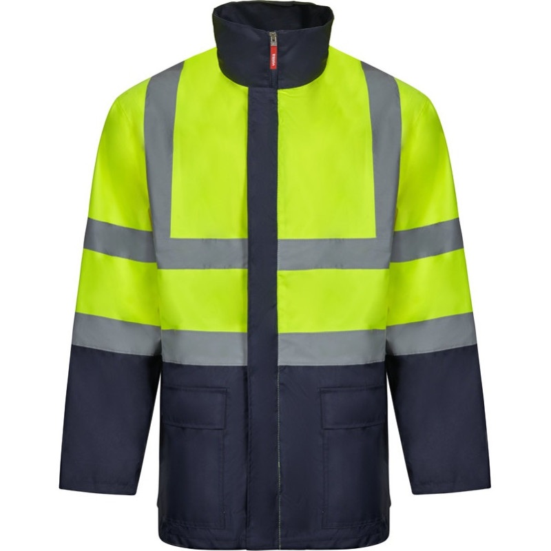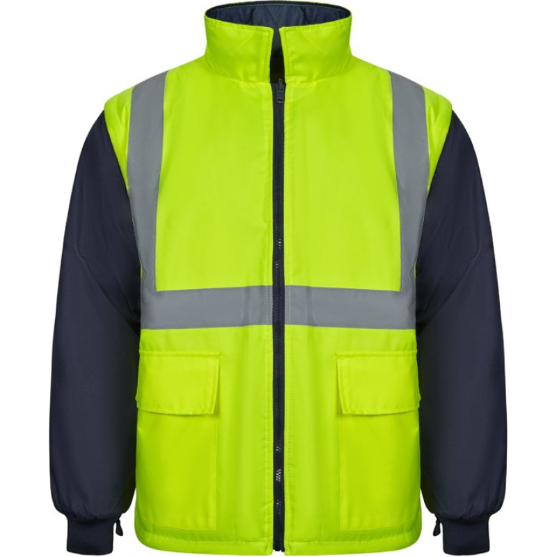 Two-tone 4-in-1 parka (180g/m²), in polyester (100%) with PU coating. Four pieces in one: parka, raincoat, jacket and vest.Parka/raincoat: with hidden central zip with placket, which closes with hook-and-loop, reflective stripes on the torso, shoulders and sleeves and hidden hood, with two lower pockets.Jacket/vest: with central zip, reflective stripes on the torso and shoulders, ribbed cuffs and detachable sleeves. With three pockets (2 lower pockets and 1 inner pocket). Product in compliance with EU Reg. 2016/425, certified by EN20471 and class Nº 2. Size: S, M, L, XL, 2XL, 3XL